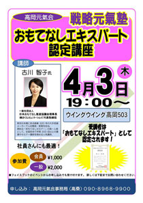 古川 智子さんをお招きして、おもてなしについて学びました。おもてなしは、相手も自分も幸せになります。 2014年4月戦略元氣塾〈2014年4月3日〉