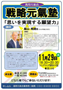 戦略元氣塾で、テーマ「最強プラス思考のつくり方」で、飯山 晄朗 さんを講師にお招きしました。飯山さんは、コーチングにより、経営やスポーツ関係で実績を挙げられております。潜在意識を脳科学を利用しながら引出、結果に結び付け […]