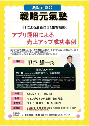 戦略元氣塾 2018年6月27日 最終更新日時 : 2026年2月24日 kanrisha@takaoka-genkikai「ITによる最新口コミ集客戦略」アプリ運用による売上アップ成功事例講師:甲谷 雄一氏日時:2018年6月27日(水)PM7時~場所:ウイングウイング高岡 501号室参加費:会員 1,000円・一般 1,500円
